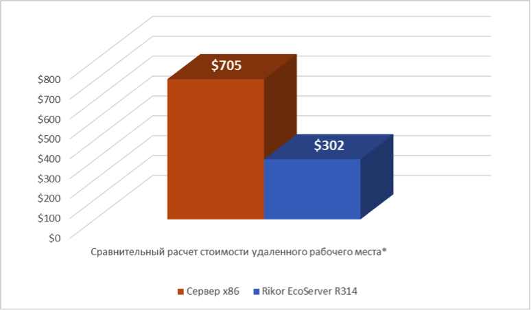 [1] Стоимость рабочего места рассчитывается из суммы затрат (оборудование+ПО) на 300 рабочих мест. Аппаратная конфигурация: 3GHz CPU, 2Gb RAM, 80Gb HDD. Используется «толстый» клиент и Citrix Reciever для подключения к рабочим столам. В расчете учтены 36 рабочих мест для отказоустойчивости.