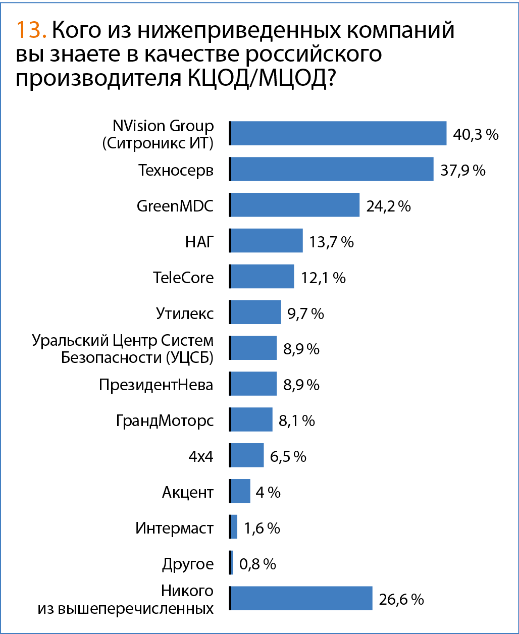 Надо сказать, что компании, принявшие участие в опросе, довольно хорошо ориентируются в российском рынке контейнерных и модульных решений, поскольку знакомы со многими его участниками — как местными, так и зарубежными. Самыми известными отечественными брендами можно считать NVision Group («Ситроникс ИТ»), «Техносерв» и GreenMDC. Если первая действительно реализовала целый ряд проектов КЦОД/МЦОД, то «Техносерв», очевидно, назвали по причине известности компании вообще на российском рынке ЦОД. Интересно также, что в тройке лидеров оказалась достаточно молодая компания GreenMDC.