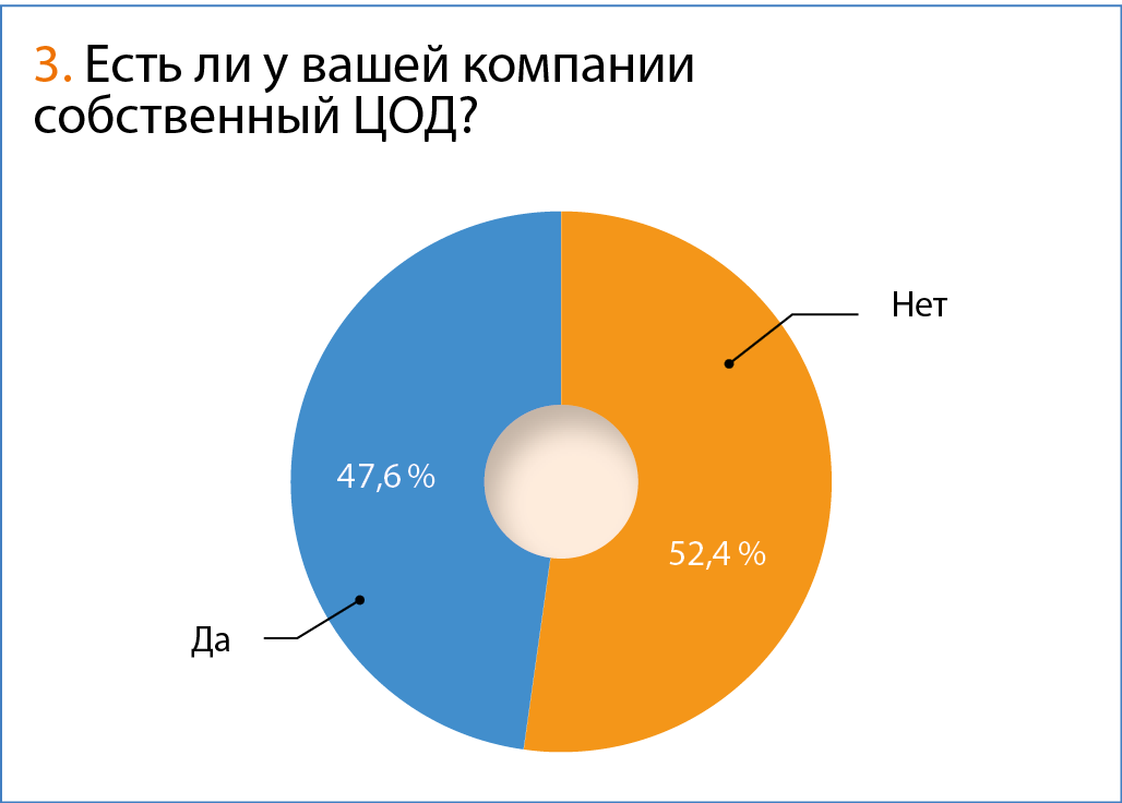 Собственный ЦОД имеют 59 компаний (47,6 %). При этом 17,7 % (22 респондента) используют контейнерные либо модульные решения. Такой процент уже можно назвать существенным, и он говорит о достаточно глубоком проникновении КЦОД/МЦОД в среду российских заказчиков.