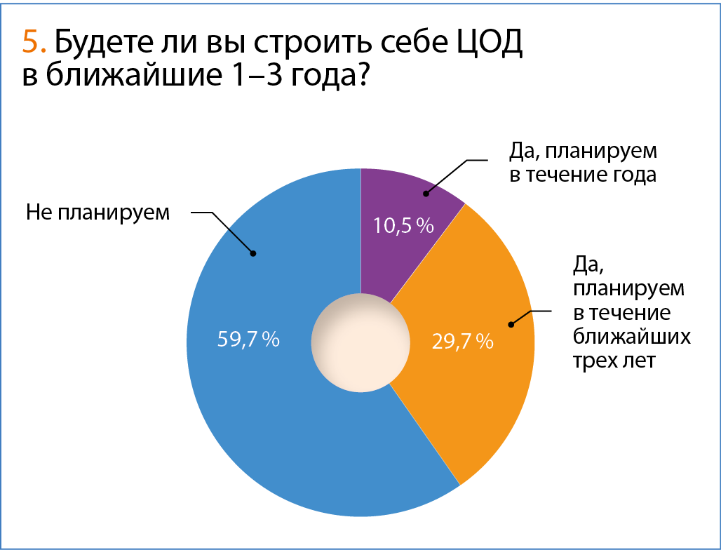 Хотя если к имеющимся 17,7 % тех, кто уже имеет КЦОД/МЦОД, добавить 40,3 % тех, кто планирует это сделать, получится, что большинство российских компаний склонны рассматривать такие решения в качестве актуальных. Это свидетельствует о положительных перспективах данного рыночного сегмента.