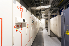 Система электропитания Linxdatacenter построена таким образом, чтобы обеспечить надежное резервирование всех ключевых элементов. Так, здесь используются четыре собственных трансформатора мощностью 1600 кВА каждый. ИБП размещены в отдельных комнатах (рис. 12). Применяются мощные модели, например Emerson 80-NET (каждый по 500 кВА).