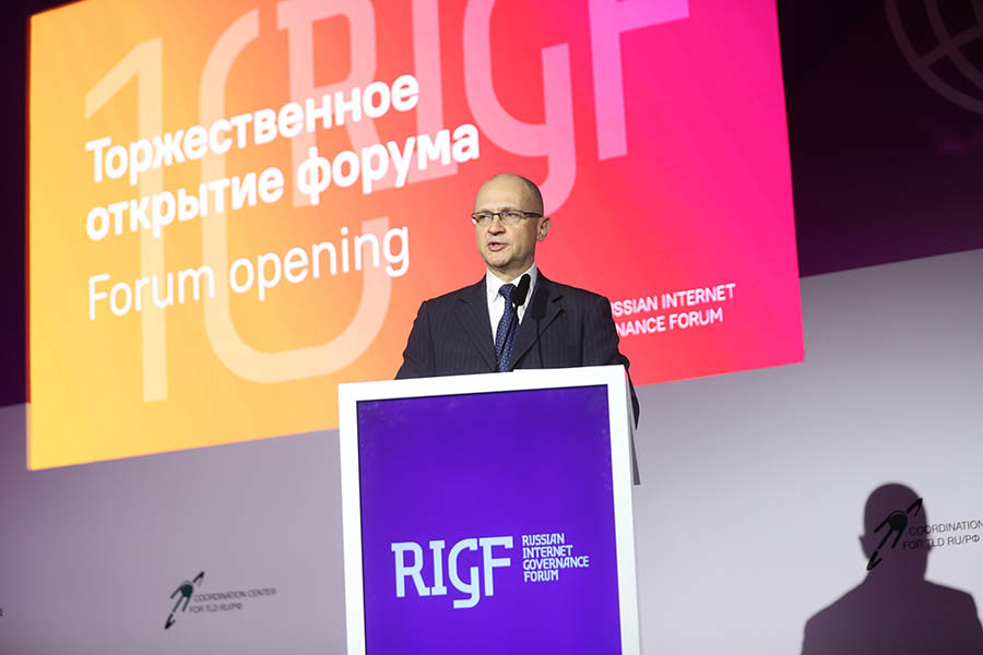 Юбилейный 10-й Российский форум по управлению интернетом (RIGF 2019) состоялся 8 апреля в Москве. Открыл форум Сергей Кириенко - Первый заместитель Руководителя Администрации Президента РФ, который зачитал поздравление Президента РФ В. В. Путина участникам форума и обозначил основные направления дискуссии в рамках последующей панельной сессии, а также поздравил всех с 25-летием Рунета.